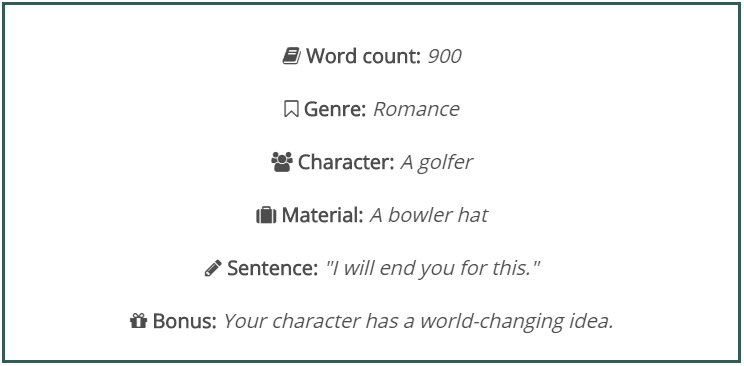 About Prompt-A-Day: The rules are simple. Every day, I generate a prompt using Story Shack’s awesome writing prompt generator. Then I set a timer for one hour. At the end of the hour, I post what I’ve got. Sometimes it’s decent. Sometimes it sucks. Sometimes I fail at the prompt. Sometimes I do okay. I do not edit, unless I find a typo, because I can’t help fixing those. Feel free to join in and post a link to your writing in the comments.