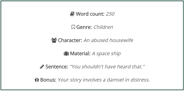 About Prompt-A-Day: The rules are simple. Every day, I generate a prompt using Story Shack’s awesome writing prompt generator. Then I set a timer for one hour. At the end of the hour, I post what I’ve got. Sometimes it’s decent. Sometimes it sucks. Sometimes I fail at the prompt. Sometimes I do okay. I do not edit, unless I find a typo, because I can’t help fixing those. Feel free to join in and post a link to your writing in the comments.