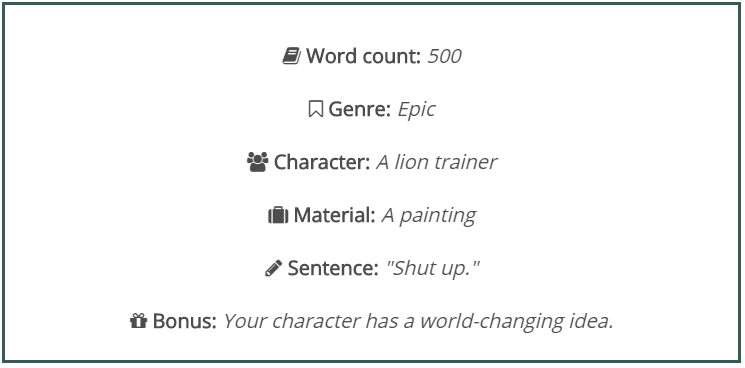 About Prompt-A-Day: The rules are simple. Every day, I generate a prompt using Story Shack’s awesome writing prompt generator. Then I set a timer for one hour. At the end of the hour, I post what I’ve got. Sometimes it’s decent. Sometimes it sucks. Sometimes I fail at the prompt. Sometimes I do okay. I do not edit, unless I find a typo, because I can’t help fixing those. Feel free to join in and post a link to your writing in the comments.