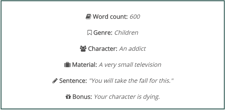 About Prompt-A-Day: The rules are simple. Every day, I generate a prompt using Story Shack’s awesome writing prompt generator. Then I set a timer for one hour. At the end of the hour, I post what I’ve got. Sometimes it’s decent. Sometimes it sucks. Sometimes I fail at the prompt. Sometimes I do okay. I do not edit, unless I find a typo, because I can’t help fixing those. Feel free to join in and post a link to your writing in the comments.